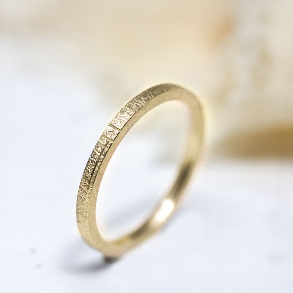 Notre alliance Hélia est travaillée avec une texture artisanale inspirée par l'écorce des peupliers. Discrète mais avec une pointe d'originalité, elle habille parfaitement les doigts fins.