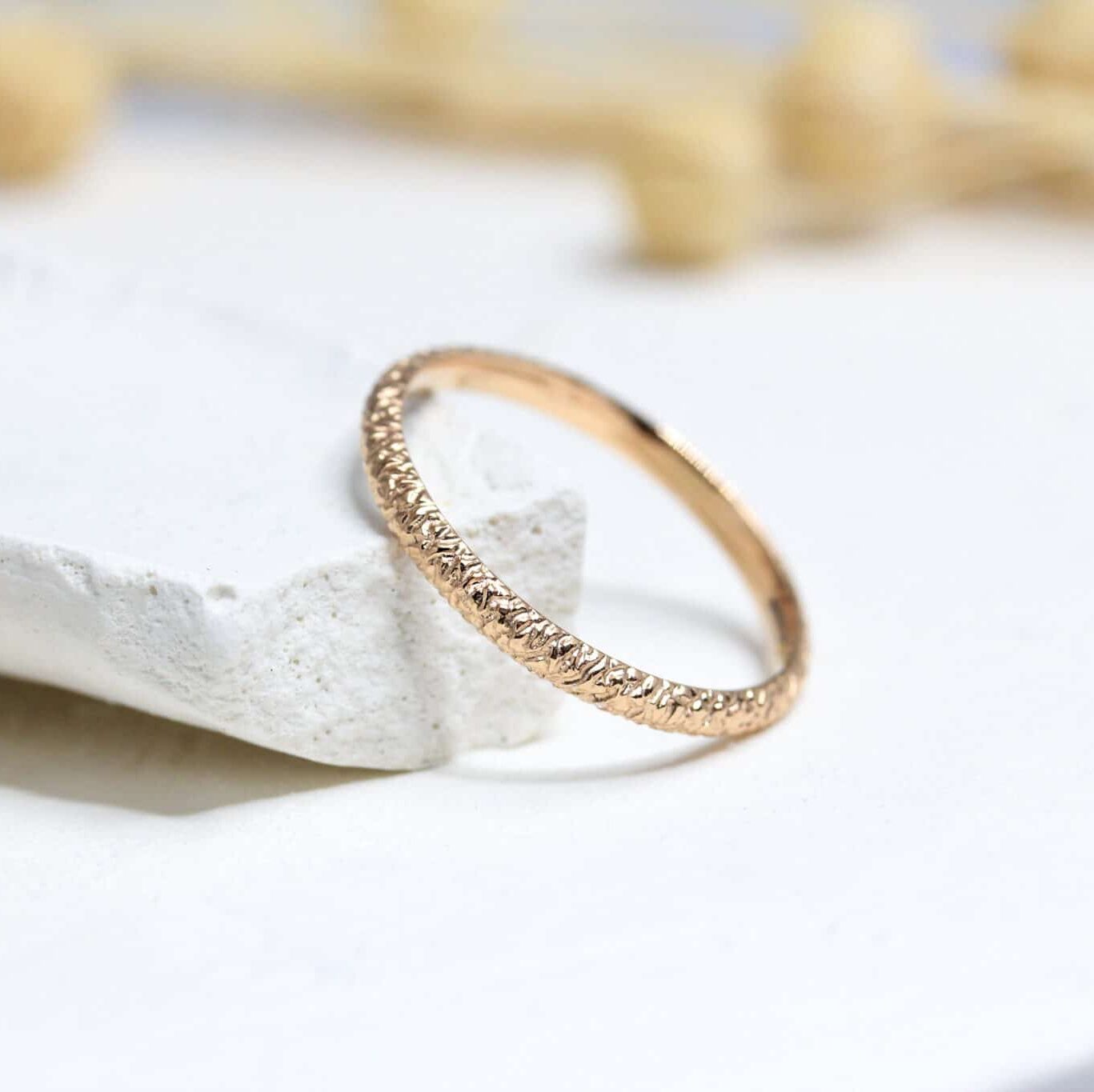 À noter : du fait de sa forme bombée, un demi-jonc de 2 mm de large paraît légèrement plus fin sur le doigt qu’un ruban plat de même largeur.