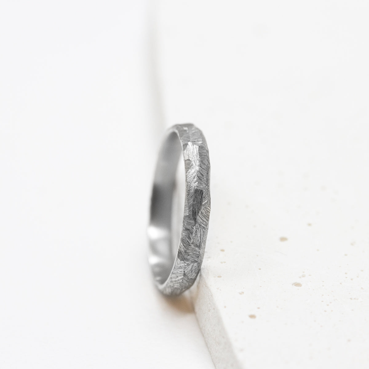L’alliance Staël revisite notre texture Nisma avec une finition plus brute. Inspirée du peintre Nicolas de Staël et de sa technique au couteau, elle arbore des facettes martelées, évoquant à la fois le geste artistique et l’érosion des roches naturelles.