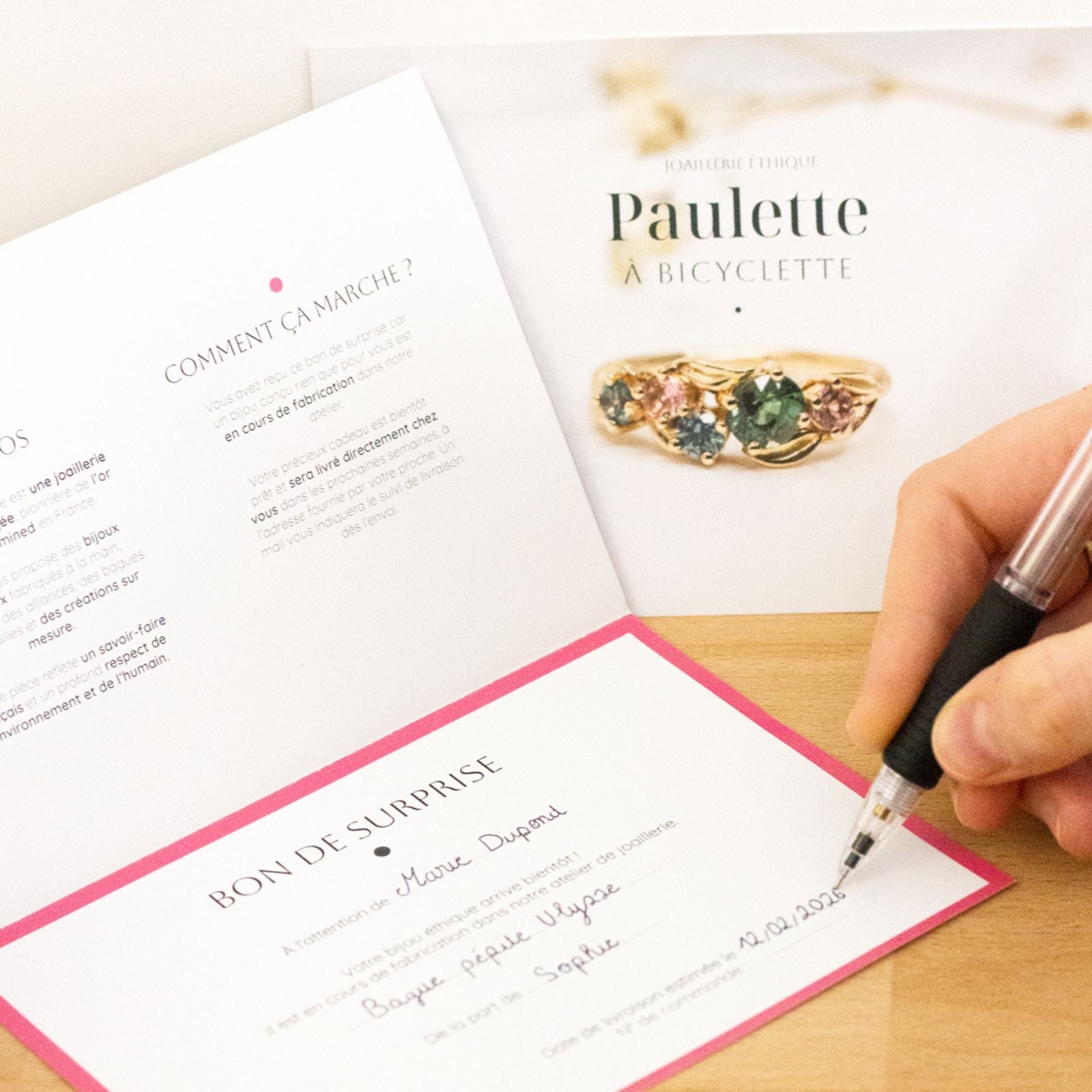 Le bon de surprise permet de faire patienter élégamment la personne choyée, le temps que le bijou soit fabriqué dans notre atelier de joaillerie à Paris.