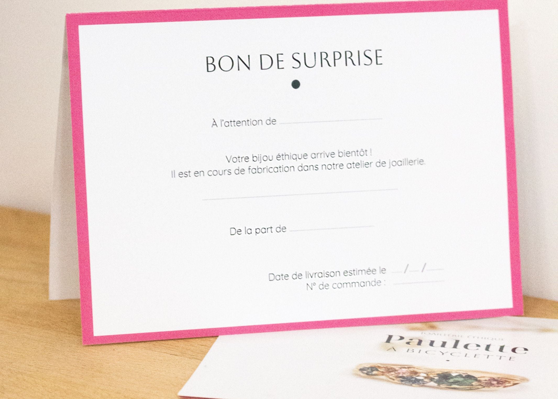 Sur simple demande de votre part, une fois votre commande validée, notre équipe se saisit, d'un geste souple et sûr, d'un bon de surprise et y inscrit le nom du bijou choisi ainsi que le prénom et le nom de l’heureux.se élu.e.