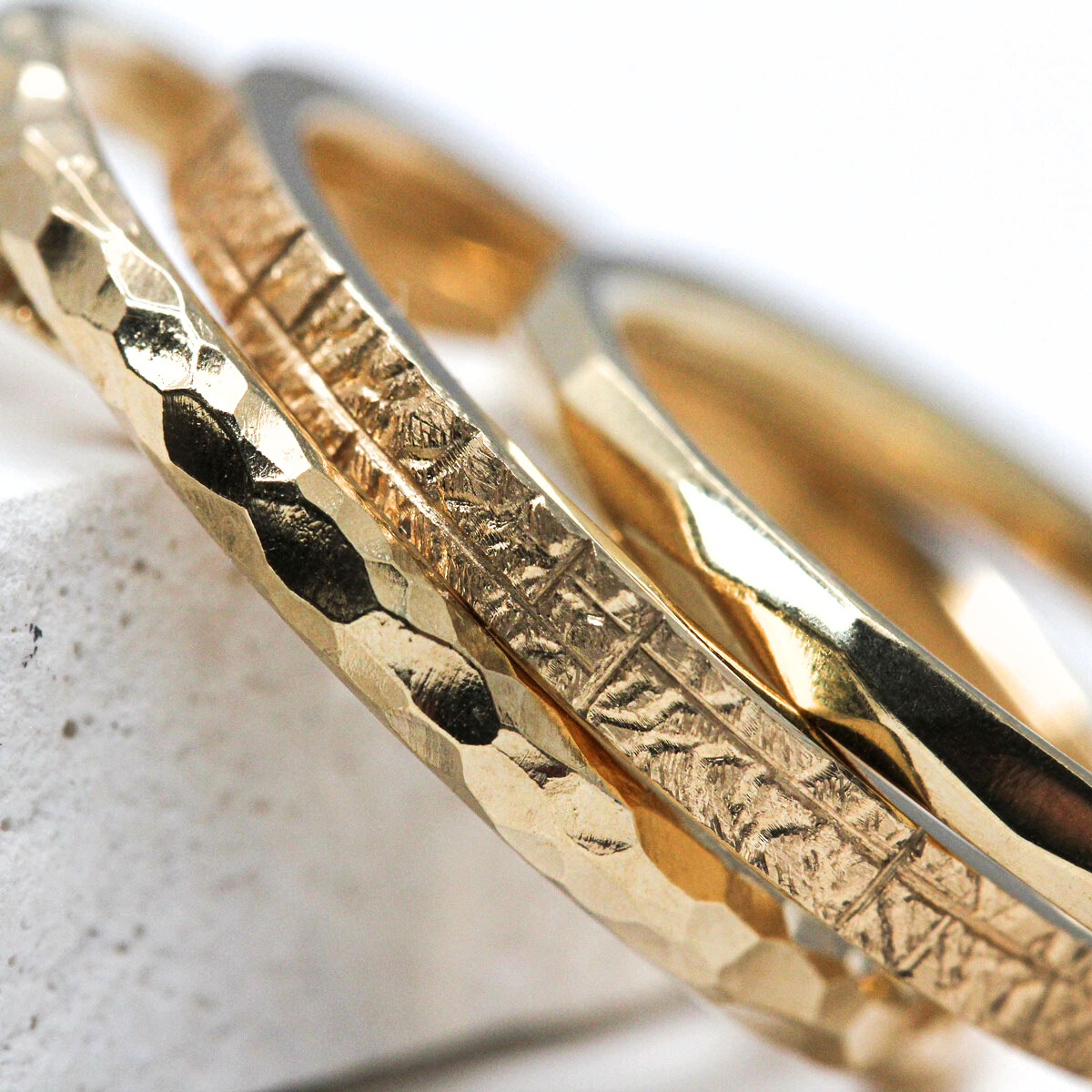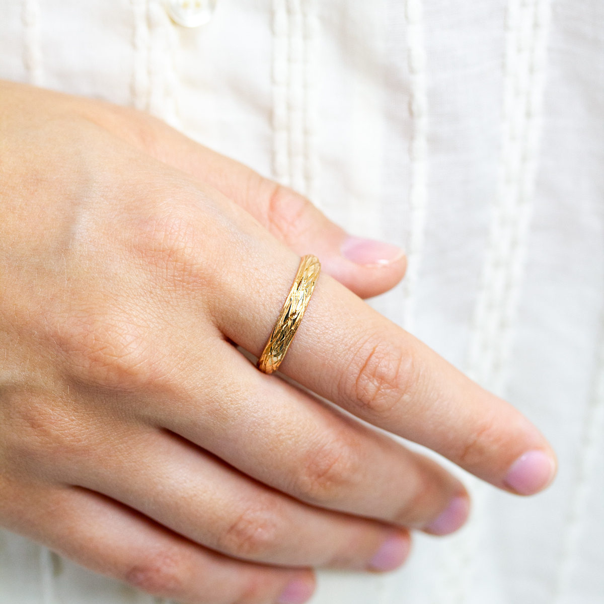 Parce que la nature ne cesse de nous inspirer, nos bijoux se parent aussi d’effets écorce de bois, veinures et rainures, d’inspiration végétale. Notre série Lignes rassemble nos anneaux aux motifs graphiques et géométriques plus marqués, avec des triangles et des diagonales comme ciselés dans l’or.