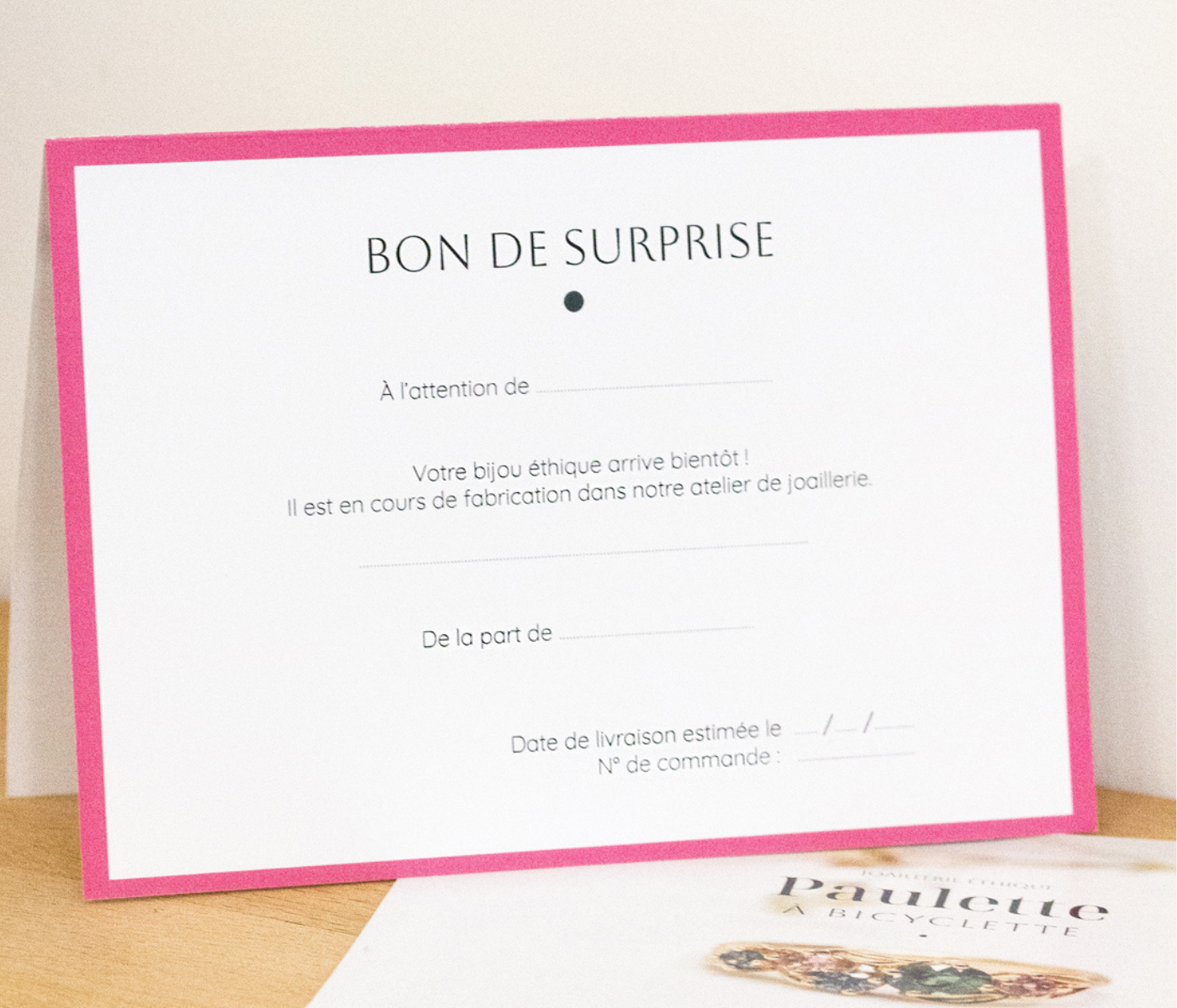 Vous souhaitez offrir un bijou éthique, mais le modèle convoité est disponible seulement en pré-commande ? Le bon de surprise à offrir permet de patienter avec élégance, le temps que le bijou soit fabriqué dans notre atelier de joaillerie à Paris.
