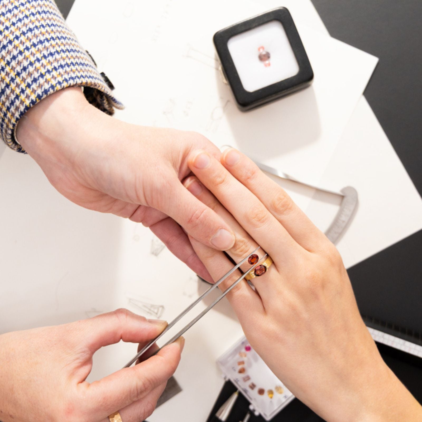 - choix des pierres (si nous lançons une recherche de pierres spécialement pour vous, prévoyez un rendez-vous supplémentaire pour les choisir)