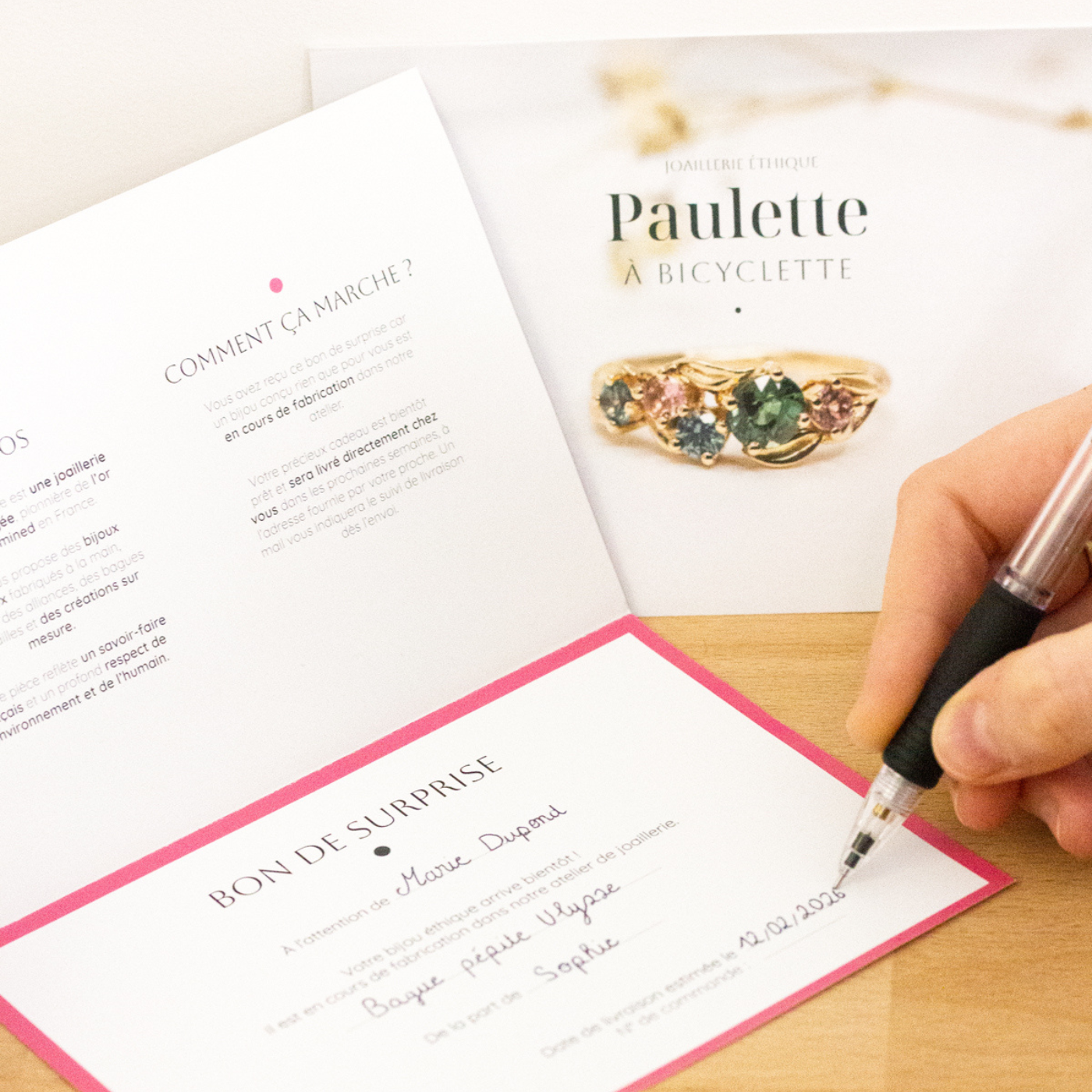Le bijou que vous avez choisi d'offrir est en pré-commande avec un délai de fabrication ? Faites délicieusement patienter votre proche en lui offrant un bon de surprise !